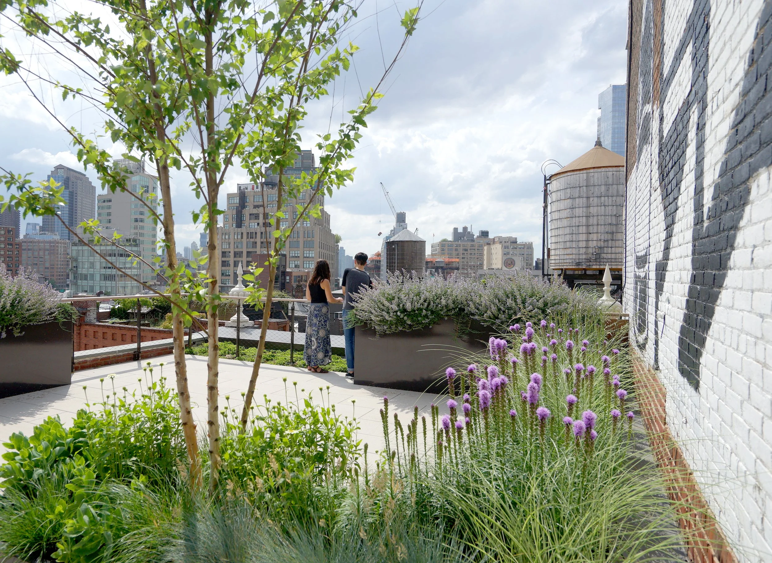 Rooftop garden with plants and trees, two people standing, urban buildings and water tower in background.